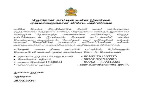 ஜோர்தான் நாட்டில் உள்ள இலங்கை குடிமக்களுக்கு விசேட அறிவித்தல்