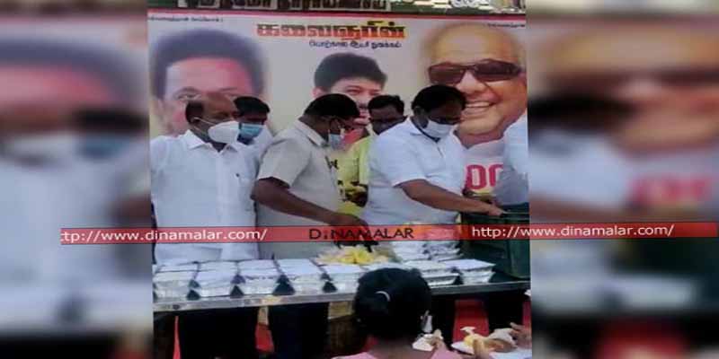 தி.மு.க., - எம்.பி., தயாநிதி, ஆயிரம்விளக்கு தொகுதி எம்.எல்.ஏ., எழிலன், பகுதிச் செயலர் அன்புதுரை, பொதுக்குழு உறுப்பினர் வி.எஸ்.ராஜ், வட்ட செயலர் யுவராஜ் உள்ளிட்ட நிர்வாகிகள் பலர் பங்கேற்றனர். பிரியாணியை வாங்க வந்தவர்கள், முகக் கவசம் அணியவில்லை, சமூக இடைவெளியும் கடைப்பிடிக்காமல், மிக நெருக்கமாக நின்று, பிரியாணி வாங்கி சென்றனர். பெருமாள் கோவில் முன் அசைவ உணவு வழங்கியது,