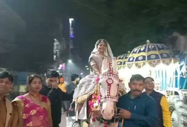 இந்நிலையில், மணமகள் அனுஷ்கா குஹா தனது திருமண நாளன்று கல்யாண கோலத்தில், கயாவில் உள்ள மணமகன் வீட்டிற்குக் குதிரையில் சென்ற வீடியோ வைரலாகி உள்ளது.
