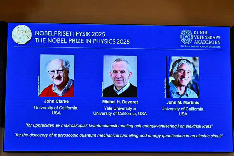 அடுத்த தலைமுறை டிஜிட்டல் தொழில்நுட்பங்களுக்கு வழிவகுத்த செயற்பாட்டில் குவாண்டம் இயற்பியலை வெளிப்படுத்திய பரிசோதனைகளுக்காக ஐக்கிய அமெரிக்காவைத் தளமாகக் கொண்ட விஞ்ஞானிகளான ஜோன் கிளார்க், மிஷெல் டெவொரெட், ஜோன் மார்ட்டின்ஸுக்கு 2025ஆம் ஆண்டுக்கான இயற்பியலுக்கான நொபெல் பரிசு கிடைத்துள்ளது.