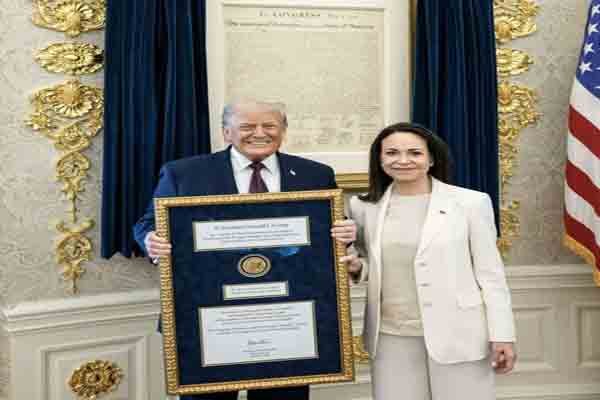 வெனிசூலா எதிர்க்கட்சித் தலைவி மரியா கொரினா மச்சாடோ அமெரிக்க ஜனாதிபதி டொனால்ட் ட்ரம்ப்பை வெள்ளை மாளிகையில் சந்தித்துப் பேச்சுவார்த்தை நடத்தியதுடன், தனது நோபல் அமைதிப் பரிசுப் பதக்கத்தை அவருக்குப் பரிசாக வழங்கியுள்ளார்.