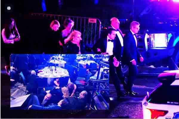 அரங்கிற்குள் திடீரென துப்பாக்கிச் சூடு போன்ற பலத்த சத்தம் கேட்டவுடன், அங்கிருந்த அதிபர் டிரம்ப், மெலனியா டிரம்ப் மற்றும் விருந்தினர்கள் அனைவரும் உடனடியாகத் தரையில் விழுந்து தங்களைப் பாதுகாத்துக் கொண்டனர்.