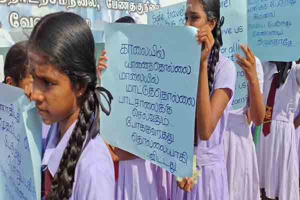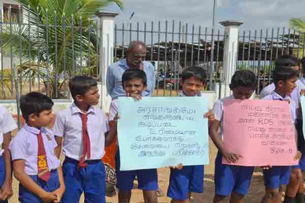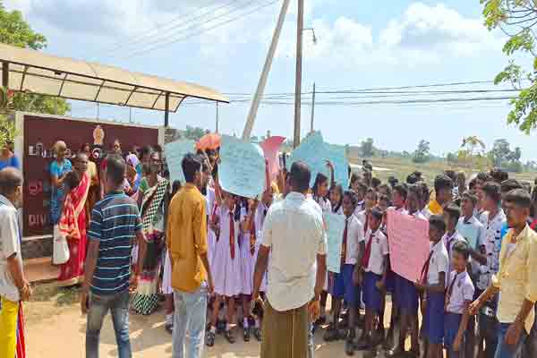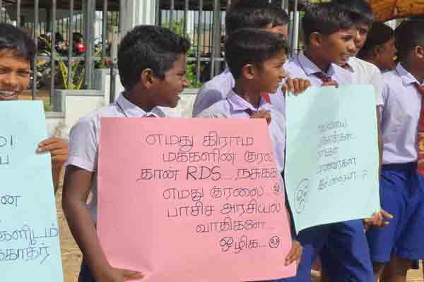 DS மாமா பேருந்து வண்டிய மீண்டும் பெற்றுதாங்க நாங்களும் ஏனையோரைப்போன்று படிக்க வேண்டும் , எமது கிராம மக்களின் குரல் தான் RDS ... எமது குரலை அடக்கும் பாசிச அரசியல் வாதிகளே ஒழிக , அரசாங்கமே எங்களுடைய அடிப்படை உரிமையான போக்குவரத்தின் பறிக்காதே ,காலையில் யானைத் தொல்லை மாலையில் மாட்டு தொல்லை பாடசாலை செல்வதும் போக்குவரத்து தொல்லை ஆகிவிட்டது என்ற பல வாசகங்கள் எழுதிய பதாகைகளை ஏந்தியவாறு போராட்டத்தில் ஈடுபட்டனர்.