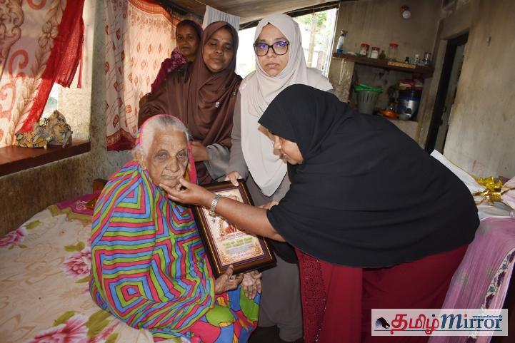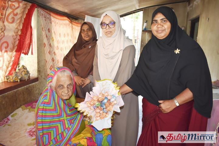 வாழைச்சேனை மத்தி பிரதேச உதவி செயலாளர் அபூசாலி ஜுமானா ஹஸீன், மகளிர் அபிவிருத்தி உத்தியோகத்தர் டபிள்யூ.ரீ. அர்சியா மற்றும் முதியோர் உரிமைகள் மேம்பாட்டு உத்தியோகத்தர் எம்.எச். சுல்பியா ஆகியோர் மூதாட்டியின் இல்லத்திற்குச் சென்று, அவரது நலன் விசாரித்ததுடன் நினைவு பரிசுகளையும் வழங்கி வைத்தனர்.
