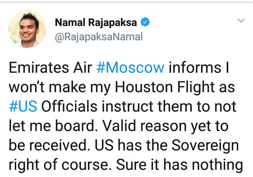 மொஸ்கோவில் இருந்து, எமிரேட்ஸ் விமானம் மூலம் அமெரிக்கா செல்ல நாமல் ராஜபக்ஸவுக்கு அனுமதி வழங்கப்படாமைக் காரணமாக,மீண்டும் நாட்டுக்கு திரும்ப வேண்டிய நிலை ஏற்பட்டதாக நாடாளுமன்ற உறுப்பினர் நாமல் ராஜபக்ஸ தெரிவித்துள்ளார்.