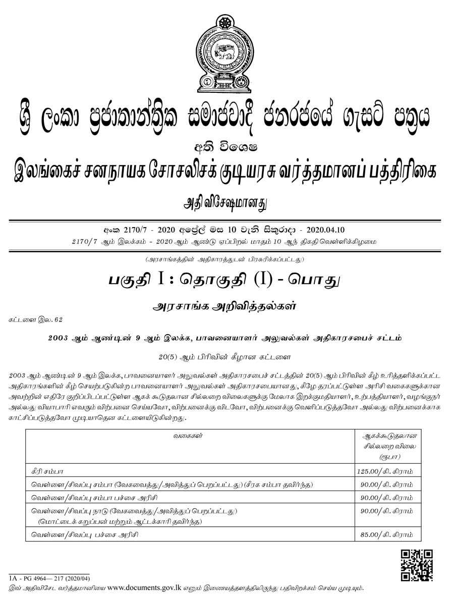 இதற்கமைவாக அரிசி வகைகளின் கிலோகிராம் ஒன்றுக்கான அதிகபட்ச சில்லறை விலை நிர்ணயிக்கப்பட்டுள்ளது.