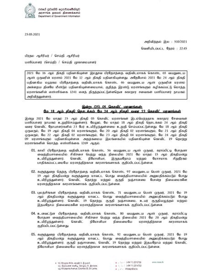 இதற்கமைய கொரோனா வைரஸ் தொற்றால் இலங்கையில் ஏற்பட்ட மரணங்கள் மொத்த எண்ணிக்கை 1,269 ஆக அதிகரித்துள்ளது.