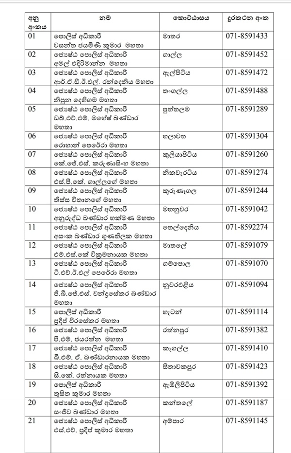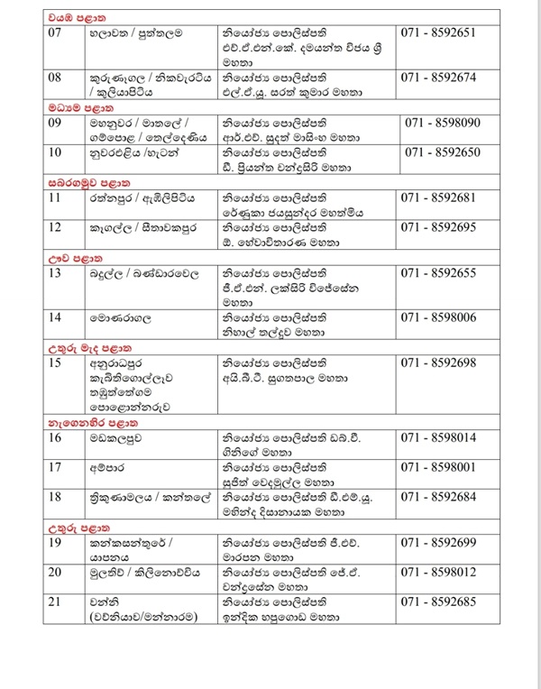 இன்று (03) முதல், சிரேஷ்ட பொலிஸ்மா அதிபர்களின் கீழ் உள்ள மாவட்டங்களுக்குப் பொறுப்பான பிரதி பொலிஸ் மா அதிபர்கள் மற்றும் பிரிவுகளுக்குப் பொறுப்பான சிரேஷ்ட பொலிஸ் அத்தியட்சகர்களின் பின்வரும் தொலைபேசி இலக்கங்களுக்கு அத்தகைய தகவல்களை வழங்கலாம் என பொலிஸ் தெரிவித்துள்ளது.