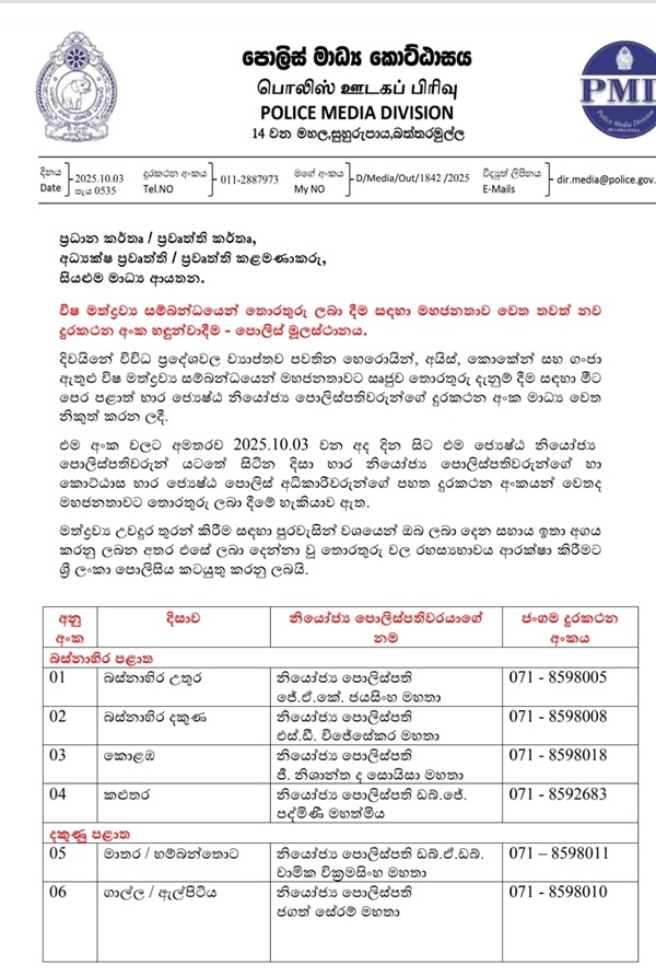 விஷ போதைப்பொருள் தொடர்பான தகவல்களை வழங்க பொதுமக்களுக்கு புதிய தொலைபேசி இலக்கங்களை பொலிஸார் அறிமுகப்படுத்தியுள்ளன.