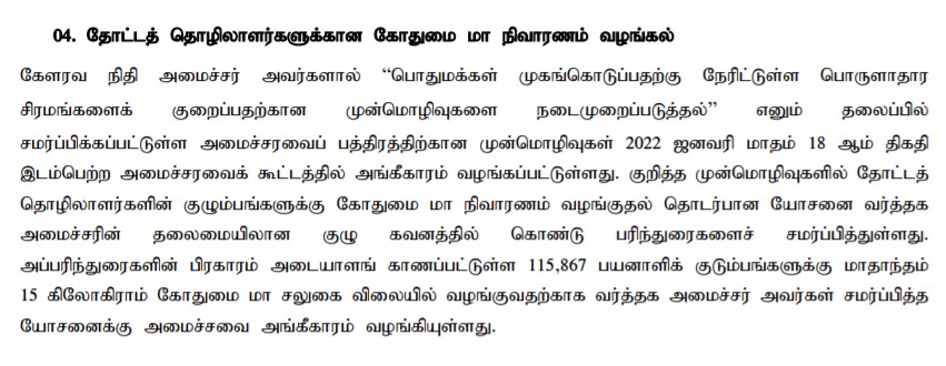 தோட்டத் தொழிலாளர்களின் குடும்பங்களுக்கு கோதுமை மா நிவாரணமாக வழங்குதல் தொடர்பான யோசனைக்கு அமைச்சரவை அங்ககீகாரம் வழங்கியுள்ளது.