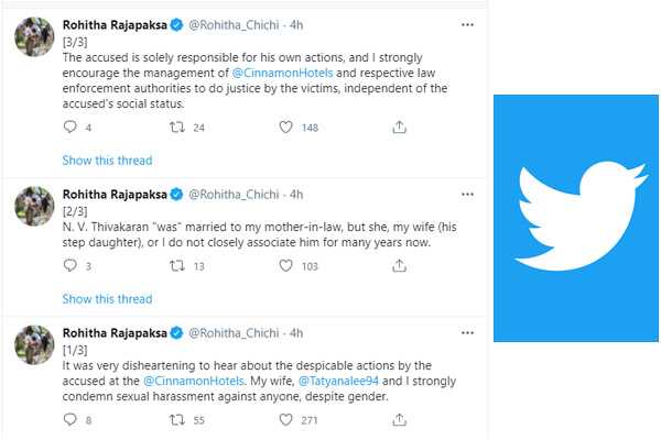 பிரதமர் மஹிந்த ராஜபக்சவின் புதல்வரான ரோஹித ராஜபக்சவின் மனைவி டட்யானாவின் வளர்ப்புத் தந்தையான இவரின் செயற்பாடுகளை கண்டித்து ரோஹித ராஜபக்ச ட்விட்டர் பதிவை இட்டுள்ளார். அதில் கொழும்பு சினமன் கிரான்ட் ஹோட்டலில் இடம்பெற்றதாக கூறப்படும் இந்த சம்பவங்கள் தொடர்பில் தாம் அதிர்ச்சியடைவதாகவும், இவ்வாறான செயற்பாடுகளை எவ்விதத்திலும் அனுமதிக்க முடியாது எனவும் குறிப்பிட்டுள்ளார். தாமும், தமது மனைவி டட்யானாவும் இந்த பாலியல் துன்புறுத்தல் செயற்பாடுகளை வன்மையாக கண்டிப்பதாகவும் குறிப்பிட்டுள்ளார்.