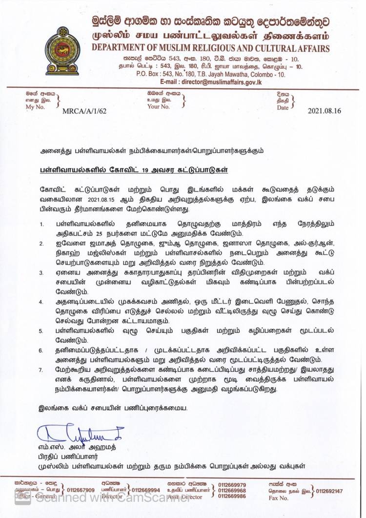 பள்ளிவாசல்களில் கூட்டுத் தொழுகை, ஜும்ஆ மற்றும் ஏனைய கூட்டு செயற்பாடுகளுக்கு வக்பு சபையினால் மறு அறிவித்தல் வரை தடை விதிக்கப்பட்டுள்ளது.