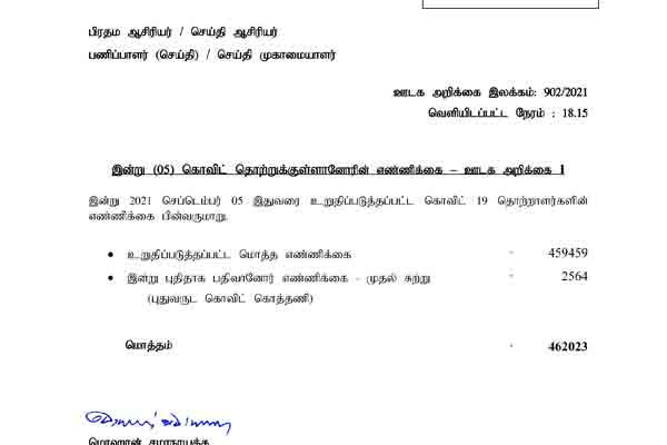 கொரோனா தொற்றாளர்களின் எண்ணிக்கை அதிகரிக்கப்பட்டுள்ளது. அதில், பிலவ கொத்தணி எண்ணிக்கை 2,564 ஆகும் என்று அரசாங்கத் தகவல் திணைக்களம் அறிவித்துள்ளது.
