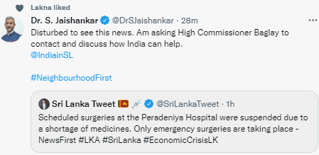 இந்தச் செய்தியைக் கண்டு கலங்கினேன். இலங்கைக்கான இந்திய உயர் ஸ்தானிகர் பாக்லேயை தொடர்பு கொண்டு இந்தியா எவ்வாறு உதவ முடியும் என்பது தொடர்பில் கலந்துரையாடுமாறு கேட்டுக் கொள்கிறேன் என்றும் அதில் குறிப்பிடப்பட்டுள்ளது.