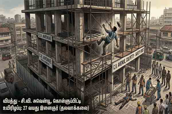 கொள்ளுப்பிட்டி சி.வி. அவென்யூ (C.V. Avenue) பகுதியில் கட்டுமானப் பணியில் ஈடுபட்டிருந்த 27 வயதுடைய இளைஞர் ஒருவர், கட்டிடத்தின் மூன்றாவது மாடியிலிருந்து தவறி விழுந்து உயிரிழந்துள்ளார்