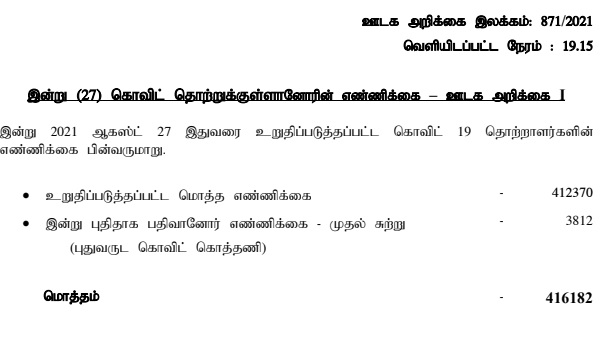 கொரோனா வைரஸ் தொற்றுக்கு உள்ளானவர்களின் எண்ணிக்கை நாட்டில், 4 இலட்சத்து 16 ஆயிரத்து 182 ஆக அதிகரித்துள்ளது. முதல்சுற்றில் இன்று (27) புதிதாக பதிவான கொரோனா வைரஸ் தொற்றாளர்களின் எண்ணிக்கை 3,812 ஆகும் என அரசாங்கத் தகவல் திணைக்களம் விடுத்துள்ள ஊடக அறிக்கையில் தெரிவிக்கப்பட்டுள்ளது.