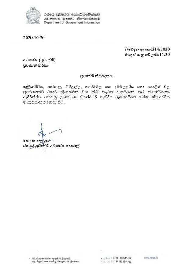 குளியாபிட்டிய, நாராம்மல, கிரிஉல்ல, பன்னல மற்றும் தும்மலசூரிய ஆகிய பகுதிகளுக்கு உடன் அமுலாகும் வகையில் பொலிஸ் ஊரடங்கு உத்தரவு அமுல்படுத்தப்பட்டுள்ளது.