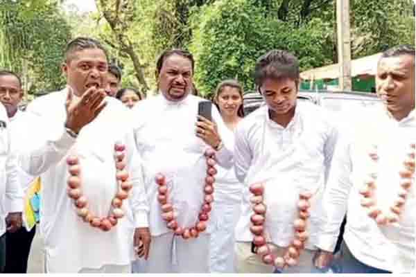 தம்புள்ளை பிரதேச சபையின் எதிர்க்கட்சி உறுப்பினர்கள் குழு செவ்வாய்க்கிழமை (11) அன்று நடைபெற்ற பிரதேச சபையின் பொதுக் கூட்டத்தில், உருளைக்கிழங்கு மற்றும் வெங்காய விவசாயிகளின் அறுவடைக்கு நியாயமான விலை கிடைக்காததை எதிர்த்து வெங்காய மாலைகளை அணிந்து கலந்து கொண்டனர்.