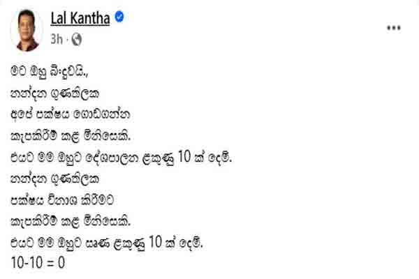 நந்தன குணதிலக்க, எங்களுடைய கட்சியை கட்டியெழுப்புவதற்கு பெரும் பாடுபட்டவர். அதற்காக அவருக்கு நான், 10 அரசியல் புள்ளிகளை வழங்கினேன். நந்தன குணதிலக்க கட்சியை சீர்குலைப்பதற்கு அர்ப்பணிப்புடன் செயற்பட்டவர் அதற்காக அவருக்கு (-10) புள்ளிகள் வழங்கியுள்ளேன்.
