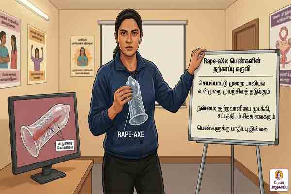 உலகெங்கிலும் பெண்களுக்கு எதிரான பாலியல் வன்முறைகள் அதிகரித்து வரும் சூழலில், தொழில்நுட்ப ரீதியிலான தற்காப்புக் கருவிகளின் தேவை அவசியமாகிறது. அந்த வகையில் 'Rape-aXe' என்பது ஒரு பெண் தனது பிறப்புறுப்பில் அணிந்துகொள்ளக்கூடிய 'பெண் கன்டோம்' (Female Condom) போன்ற ஒரு சாதனமாகும். இது பாலியல் வன்முறை முயற்சி நடக்கும்போது குற்றவாளியை முடக்கும் வகையில் வடிவமைக்கப்பட்டுள்ளது.