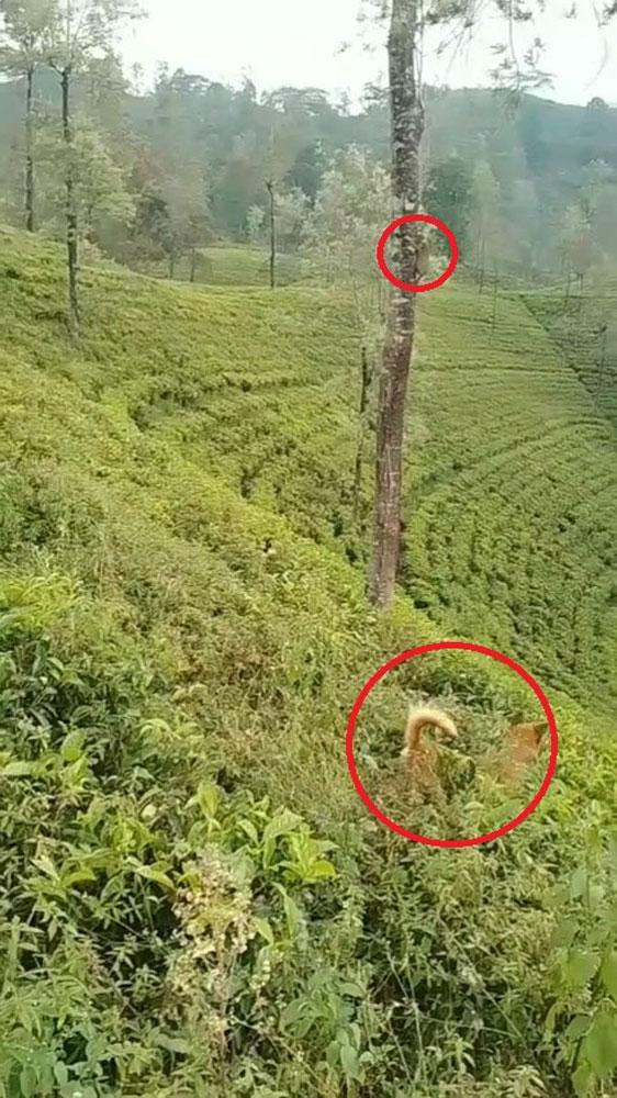 சிறுத்தை மற்றும் அதன் குட்டி, அந்தப் பகுதியில் சுற்றித் திரியும் நாய்களைத் தேடி தேயிலைத் தோட்டத்திற்குள் நுழைந்தன. சிறுத்தை ஒரு நாயை வேட்டையாட முயன்றபோது, அருகிலுள்ள பல நாய்கள் ஒன்று சேர்ந்து சிறுத்தையையும் குட்டியையும் துரத்தியதாகக் கூறப்படுகிறது.