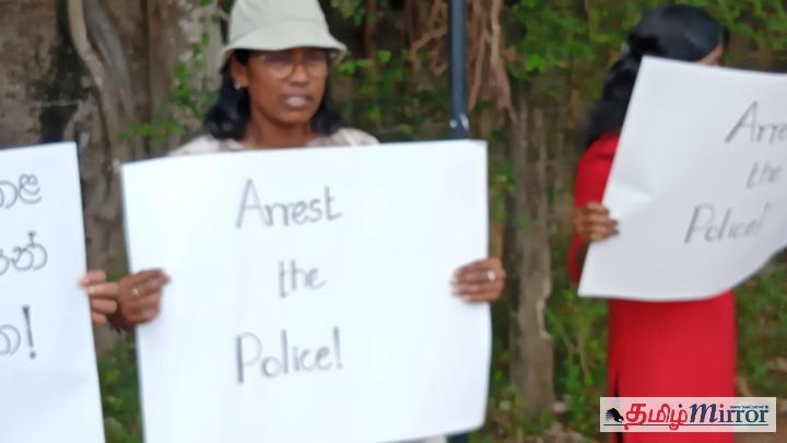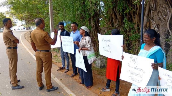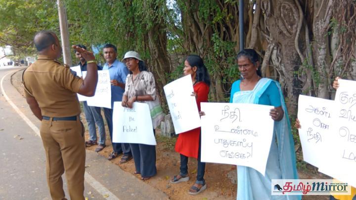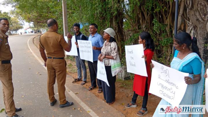 நீதிமன்றத்திற்கு முன்பாக ஆரம்பமான ஆர்ப்பாட்டத்தில் பொலிஸாருக்கு எதிரான கோஷங்கள் அடங்கிய சுலோக அட்டைகளை ஏந்தியவாறு ஆர்ப்பாட்டக்காரர்கள் தமது எதிர்ப்பை வெளியிட்டனர். எனினும், நீதிமன்ற வளாகத்திற்கு முன்பாக ஆர்ப்பாட்டம் நடத்த முடியாது என பொலிஸார் அறிவுறுத்தியதை அடுத்து, ஊர்காவற்றுறை பொலிஸ் நிலையத்திற்கு முன்பாக திரண்டு ஆர்ப்பாட்டத்தில் ஈடுபட்டனர்.