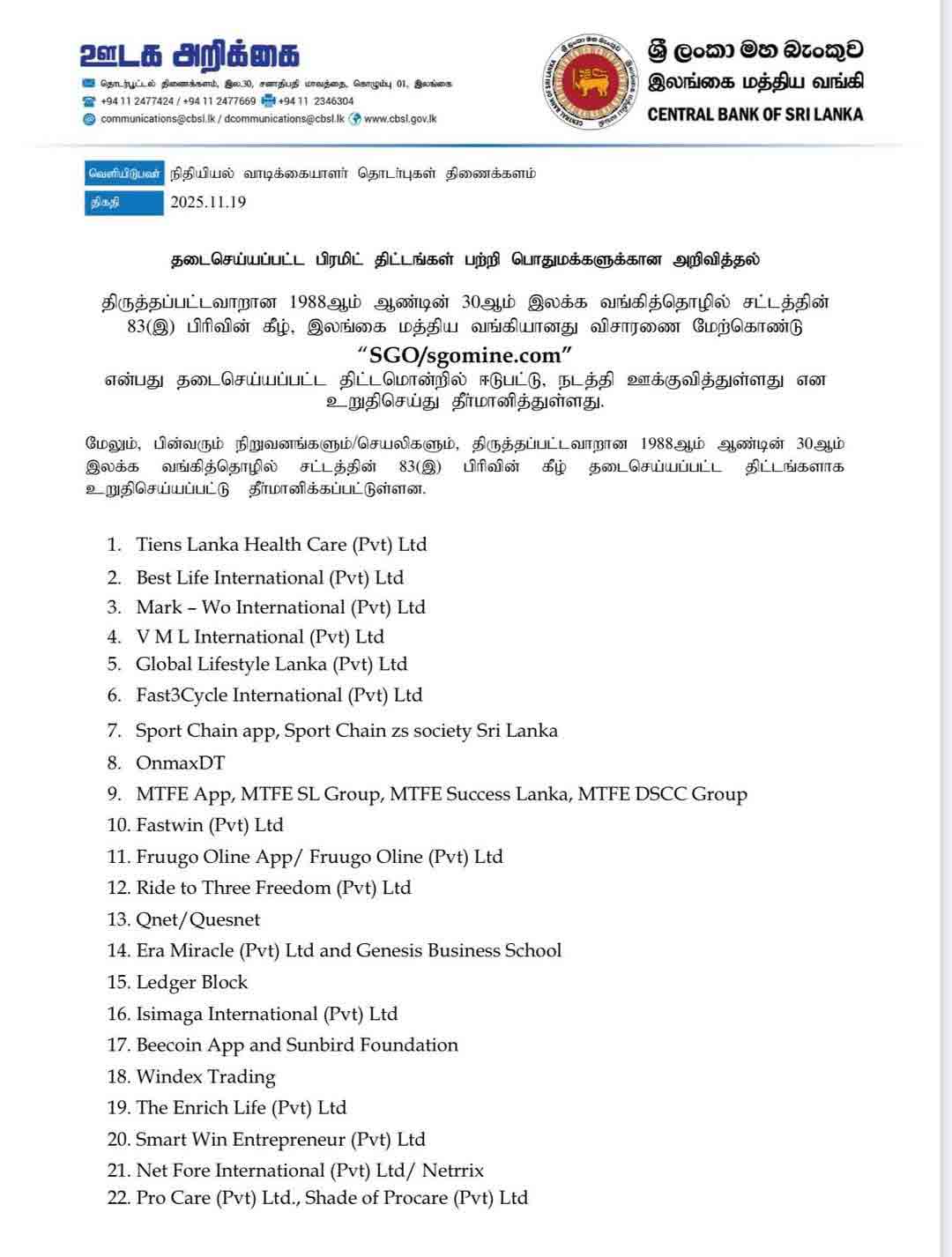 தடைசெய்யப்பட்ட பிரமிட் திட்டங்கள் தொடர்பான விபரங்களை, இலங்கை மத்திய வங்கி வெளியிட்டுள்ளது.