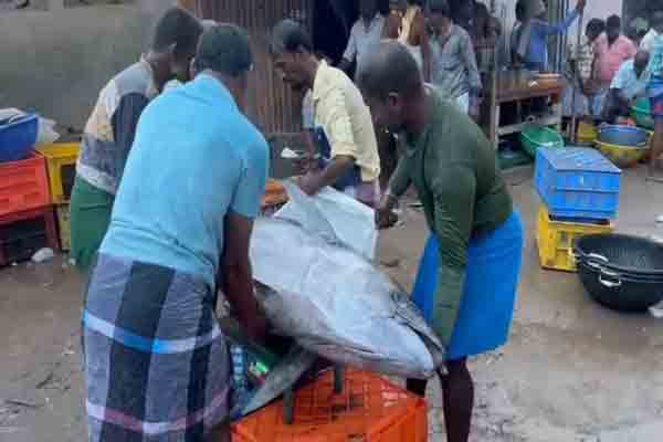 இந்நிலையில் பாம்பன் அந்தோனியார்புரம் பகுதியை சேர்ந்த கிளிண்டன் என்பவருக்கு சொந்தமான படகில் சுமார் 3 மீட்டர் நீளம் கொண்ட 115 கிலோ எடை கொண்ட மஞ்சள் வால் கேரை மீன் என்றழைக்கப்படும் அம்பர்ஜாக் மீன் ஒன்று சிக்கியது.