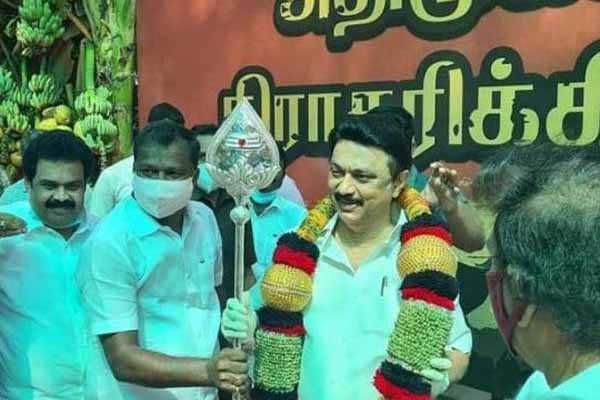 திருத்தணியில் நடந்த நிகழ்ச்சியில், தி.மு.க., தலைவர் ஸ்டாலினுக்கு வெள்ளி வேல் வழங்கப்பட்டது
