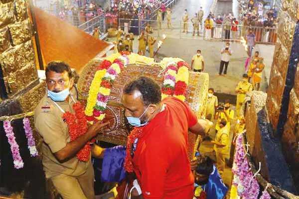 சபரிமலை கோவிலில் நேற்று சுவாமி ஐயப்பன் தங்க அங்கியில் காட்சி அளித்தார். சிகர