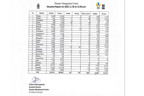 இலங்கையில் ஏற்பட்ட சீரற்ற வானிலையில் இதுவரை 9 இலட்சத்து 68 ஆயிரத்து 304 பேர் பாதிப்படைந்துள்ளதாக பேரிடர் மேலாண்மை மையம் தெரிவித்துள்ளது.
