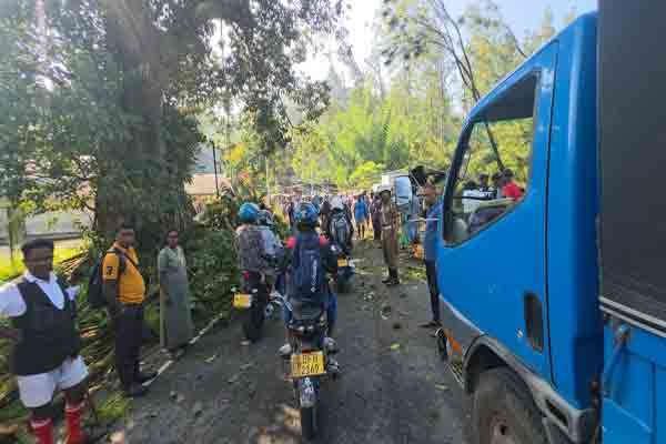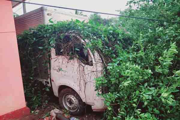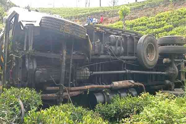 மரக்குற்றிகளுடன் பார ஊர்தி பள்ளத்தில் கவிழ்ந்தது...
