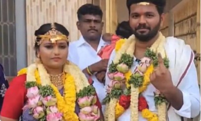 கல்யாணம் முடிந்தவுடன்… நேராக வாக்குச்சாவடியில் என்ட்ரி! வாக்களித்த பின் மீண்டும் திருமண மேடைக்கே திரும்பிய மணமக்கள்.'