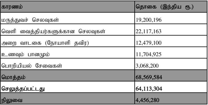 ஆனால், இவ்வாறு செலவளிக்கப்பட்ட பணத்தில், சுமார் 5 மில்லியன் ரூபாய், வைத்தியசாலைக்கு வெளியே முகாமிட்டிருந்த ஊடகவியலாளர்களுக்கு உணவு வழங்குவதற்காகச் செலவளிக்கப்பட்டது எனவும், 2.5 மில்லியன் இந்திய ரூபாய், பொலிஸாருக்கு உணவு வழங்குவதற்காகவும், 2 மில்லியன் இந்திய ரூபாய், முக்கியமான விருந்தினர்களுக்கான உணவுக்காகவும், மேலும் 2 மில்லியன் இந்திய ரூபாய், அரச அதிகாரிகளுக்கு உணவு வழங்குவதற்காகவும் செலவளிக்கப்பட்டது என, தகவல்கள் தெரிவிக்கின்றன.