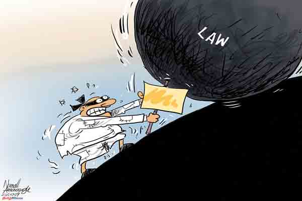 தங்களை நோக்கி உருண்டுவரும் சட்டத்தை அரசியல்வாதிகள் தடுத்து நிறுத்துவதாக இந்த சிந்தனைச் சித்திரம் கீறப்பட்டுள்ளது..