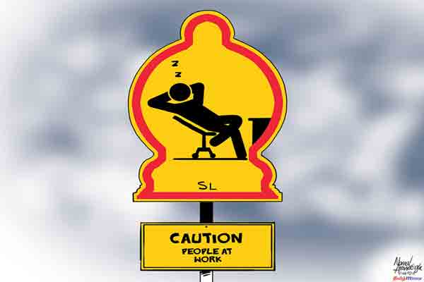 "வேலையில் மக்கள்" (PEOPLE AT WORK) என்று குறிப்பிடப்பட்டுள்ள எச்சரிக்கை பலகையில், ஒரு நபர் வேலை செய்வதற்குப் பதிலாக நாற்காலியில் அமர்ந்து கொண்டு, கைகளைத் தலைக்கு மேலே வைத்துக்கொண்டு தூங்குவதைப் போன்ற படம் சித்தரிக்கப்பட்டுள்ளது.