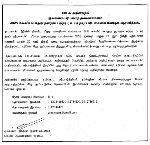அந்த வகையில் நடைபெறாத பாடங்களை 2026 ஜனவரி மாதம் 12 ஆம் திகதி முதல் ஜனவரி 20 ஆம் திகதி வரை நடத்துவதற்கு ஏற்பாடுகள் செய்யப்பட்டுள்ளன. R