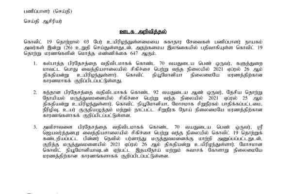 கொரோனா வைரஸ் தொற்றுக்குள்ளாகி மரணித்தோரின் எண்ணிக்கை 647 ஆக அதிகரித்துள்ளது. நேற்றைய அறிக்கையின் பிரகாரம், மூவர் மரணமடைந்துள்ளனர்.