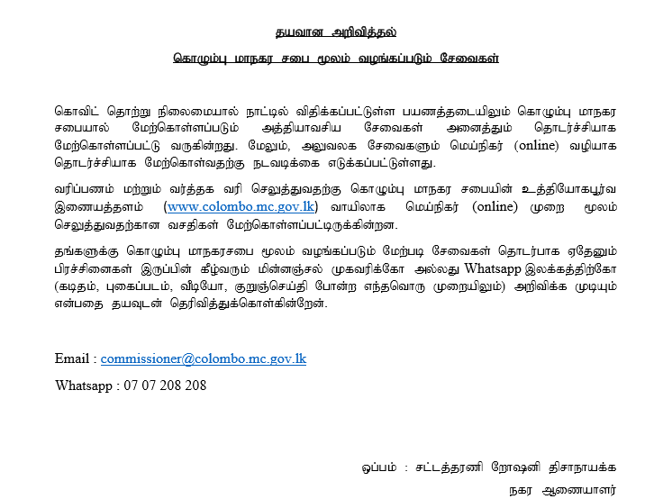 கொழும்பு மாநகர சபை, நகர ஆணையாளர் சட்டத்தரணி ரோஷினி திஸாநாயக்க முக்கிய அறிவித்தல் ஒன்றை விடுத்துள்ளார்.