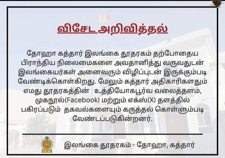 மத்திய கிழக்கு நாடுகளில் ஏற்பட்டுள்ள போர் பதற்றத்தை அடுத்து தோஹா, கட்டாரில் இருக்கும் இலங்கையர்களுக்கு விசேட அறிவித்தல் விடுக்கப்பட்டுள்ளது..