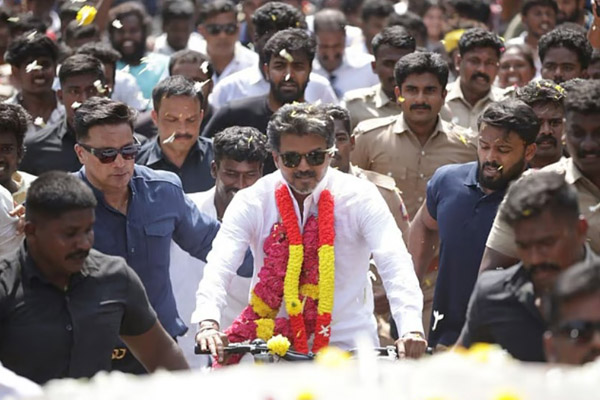 மதுரையிலிருந்து வரும் வழியில் த.வெ.கவினர் திரண்டதால், அவர்களுக்கு கையசைத்தபடி விஜய்யின் வாகனம் ஆமை வேகத்தில் பயணித்தது. இடையில் திடீரென பிரச்சார வாகனத்தில் இருந்து இறங்கிய விஜய், அவருக்கு தயாராக வைக்கப்பட்டிருந்த சைக்கிளில் ஏறி பயணிக்க தொடங்கினார். இதனால் அவர் காரைக்குடிக்கு வருவதற்கு மிகவும் தாமதமானது.