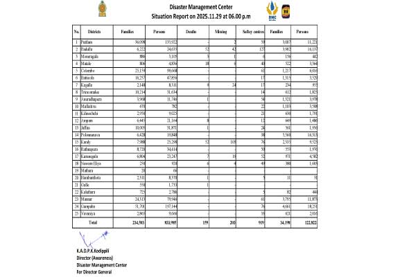 பேரிடர் மேலாண்மை மையத்தில் வெளியிடப்பட்டுள்ள அறிக்கையில் இயற்கை அனர்த்தத்தினால் காவுக்கொண்ட மனித உயிர்களின் விபரம் காயங்களுக்கு உள்ளாகியவர்களின் தொகை மற்றும் மாயமானவர்களின் விபரம் பாதிப்புக்குள்ளாகி யர்கள் பற்றிய தகவல்களை வழங்கியுள்ளது.