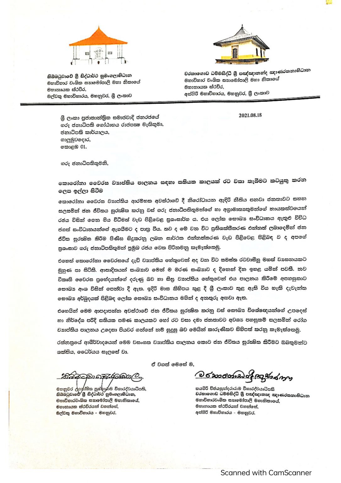 ஒருவாரத்துக்கு நாட்டை முழுமையாக முடக்குமாறு, கண்டி அஸ்கிரிய மற்றும் மல்வத்த மகாநாயக்க தேரர்கள், ஜனாதிபதி கோட்டாபய ராஜபக்ஷவுக்கு கடிதமொன்றை அனுப்பிவைத்துள்ளனர்.