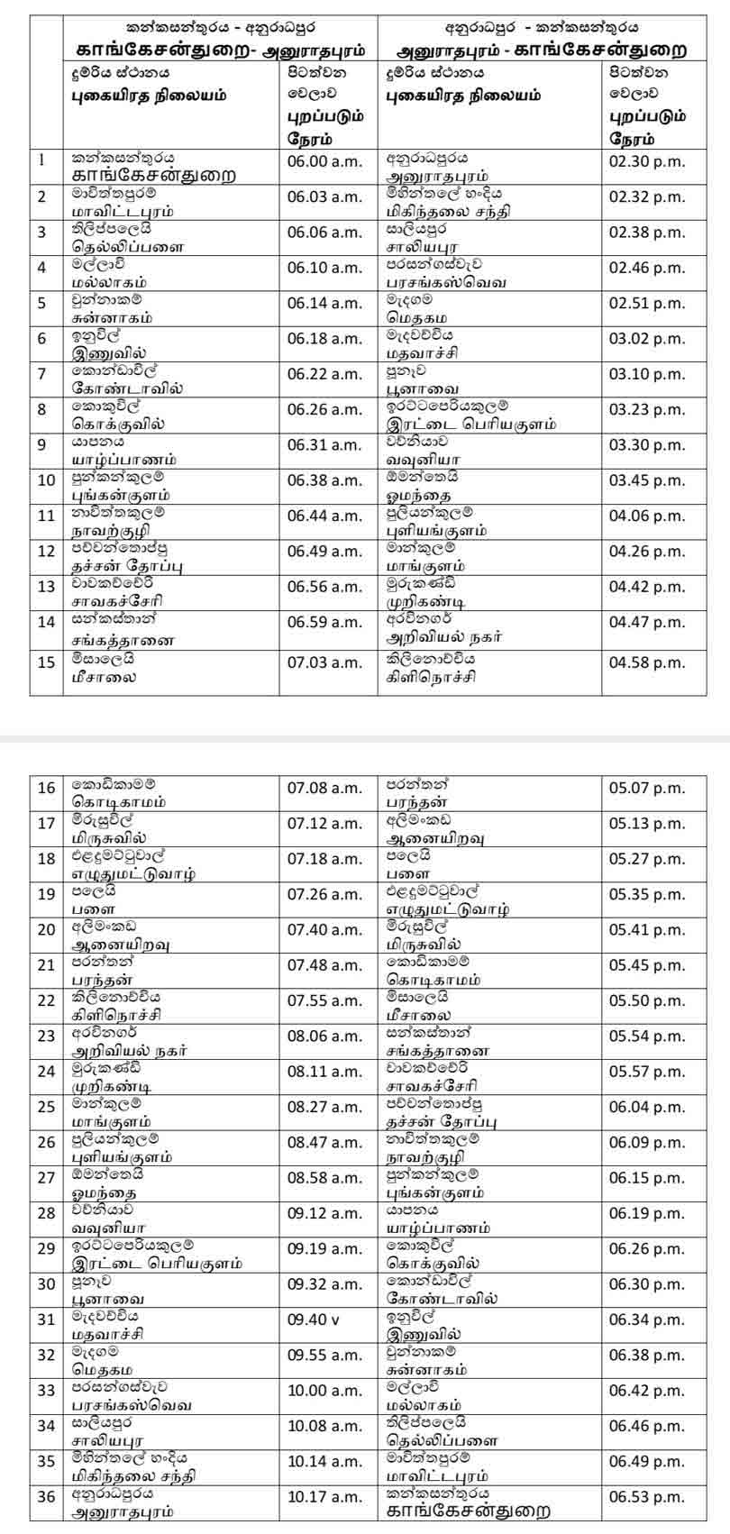 யாழ்ப்பாணம் காங்கேசன்துறைக்கும் அனுராதபுரத்துக்கும் இடையிலான இருவழி ரயில் சேவைகள் திங்கட்கிழமை (22) முதல் ஆரம்பமாகும் என ரயில்வே கட்டுப்பாட்டறை அறிவித்துள்ளது,