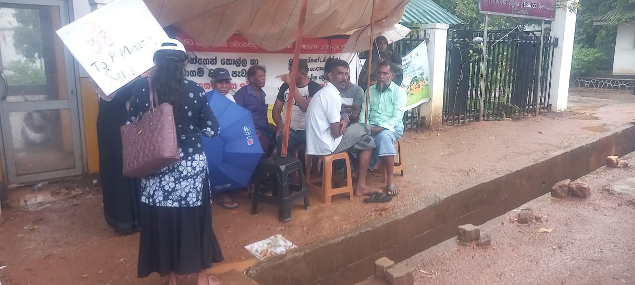 திருகோணமலை மாவட்ட செயலகம் முன் குறித்த போராட்டம் அடைமழையும் பாராது அப்பாவி ஏழை விவசாயிகள் தங்களது சிறு குழந்தைகளுடன் தீர்வு கோரி போராடி வருகின்றனர்.