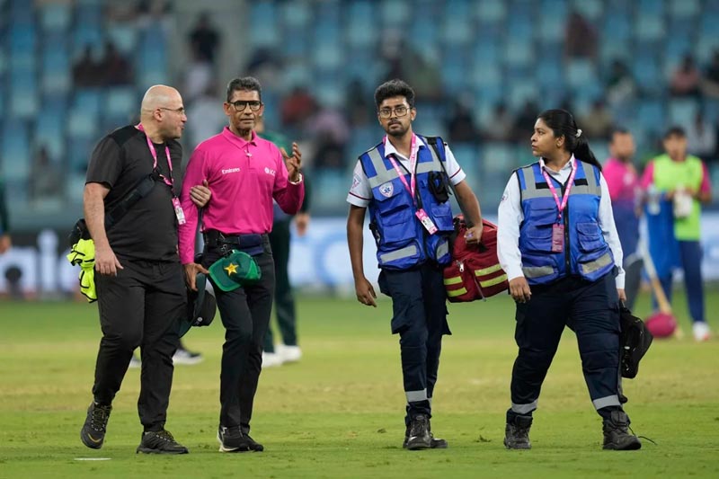 ஆசிய கிண்ணத் தொடரில், பாகிஸ்தான், ஐக்கிய அரபு அமீரகத்துக்கிடையேயான போட்டியில் பாகிஸ்தான் களத்தடுப்பாளரொருவர் எறிந்த பந்து நடுவரைத் தாக்கிய நிலையில் அவர் களத்தை விட்டு வெளியேறியிருந்தார்.