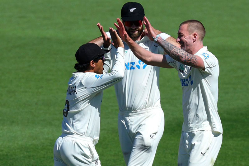 பதிலுக்கு தமது முதலாவது இனிங்ஸில் துடுப்பெடுத்தாடி வரும் நியூசிலாந்து, இன்றைய முதலாம் நாள் முடிவில் விக்கெட் இழப்பின்றி 24 ஓட்டங்களைப் பெற்றுள்ளது. களத்தில் லேதம் ஏழு ஓட்டங்களுடனும், டெவொன் கொன்வே 16 ஓட்டங்களுடனும் ஆட்டமிழக்காமலுள்ளனர்.