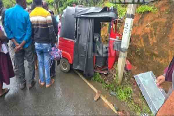 கனமழை காரணமாக வழுக்கும் சாலையில் சென்ற முச்சக்கர வண்டி கட்டுப்பாட்டை இழந்து மின் கம்பத்தில் மோதியதால் விபத்து ஏற்பட்டது.